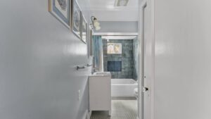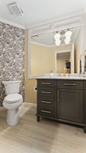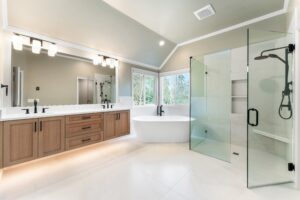 Harbor Pointe Primary BathroomWith this project we got to showcase one of our favorite color palettes, and a perfectly practical bathroom to match. The tall ceilings and generous floor plan were the perfect canvas to accept a gorgeous floating white oak vanity made to size, a large format tile with which to wrap the floor and walls, a curbless shower pan, a soft under-cabinet light activated by a motion sensor for those sleepy midnight walks to the bathroom, and of course a heated floor that extends into the shower.