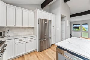 Harbor Pointe KitchenThis Harbour Pointe kitchen received the signature CraftHaus makeover, featuring handsome European-style cabinetry where every door and filler showcase perfectly consistent reveals. The custom, color-matched true white shaker cabinets offer a classic look that never goes out of style – paired with a freshly refinished red oak hardwood floor. Behind the scenes the kitchen also received a full suite of electrical upgrades to bring it up to modern code and safety requirements.